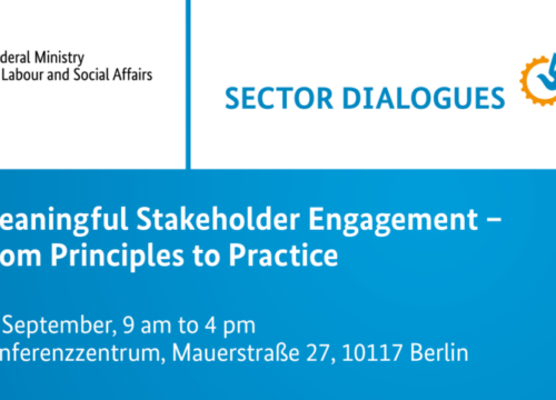 Mit der Konferenz „Meaningful Stakeholder Engagement – From Principles to Practice“ am 16. September 2025 bieten das BMAS und die Branchendialoge eine Plattform, um Erfahrungen auszutauschen, Erfolgsbeispiele vorzustellen und praxisnahe Lösungsansätze zu diskutieren.